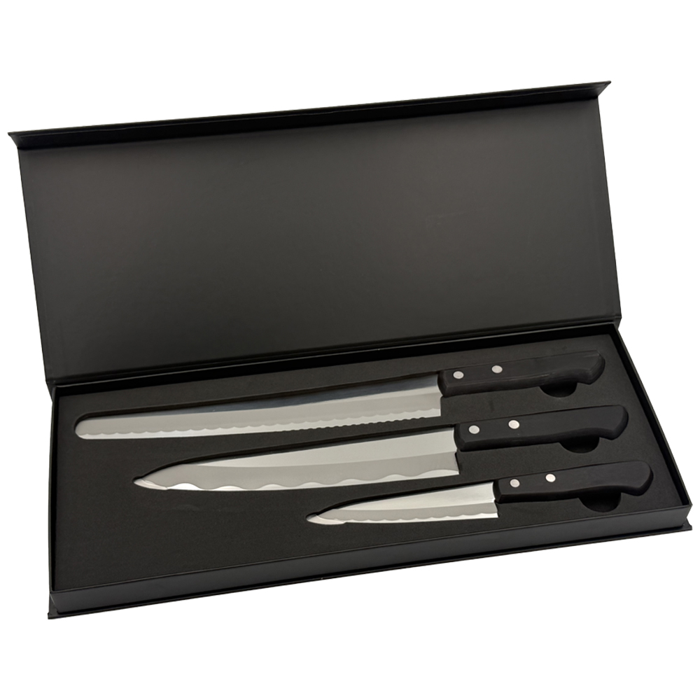 Dette eksklusive knivsettet består av to japanske kokkekniver og én fransk konditorkniv – nøye utvalgt for å gi deg en optimal kombinasjon på kjøkkenet.